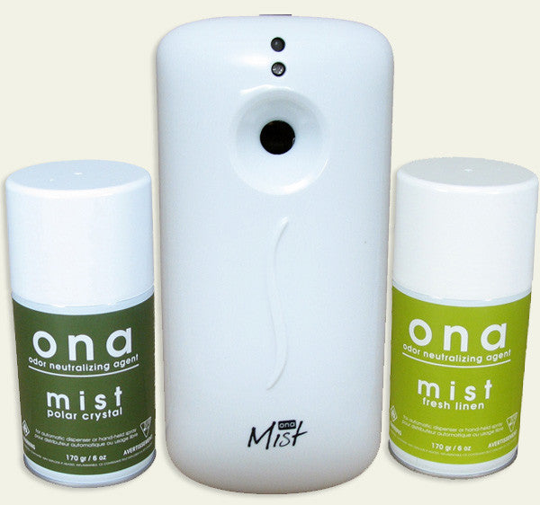 The ONA Mist Dispenser is a great way to control odors in small rooms and areas where the odor source is constant or repeated. Rooms such as bathrooms, entry or exit areas, pantries, workshops, and garbage collection areas that are approximately 6,000 cubic feet (170 sq. meters) are aptly serviced with an ONA Mist Dispenser - under normal airflow conditions.